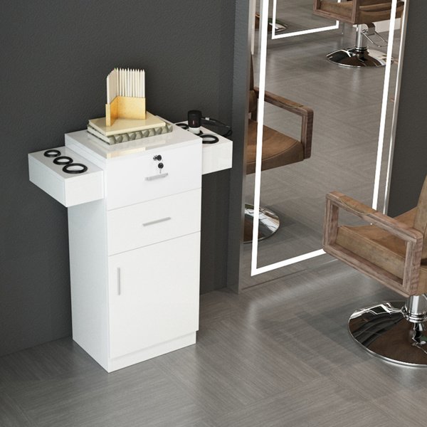 Introductions: Do you need a practical drawer? If so, you can have a try of our Barbershop Salon Locker / Hair Dryer Rack Drawer.This Locking Trolley Station is made of high quality MDF and ABS plastic, which is eco-friendly and durable in use. The MDF board surface is veneered in slick uniform white color. The veneer decorative board increases the brightness of the surface, protects the surface from worn, and is easy to clean. Also if you desire, lock it for easy and secure storage. What do you hesitate for? Hurry and place an order!