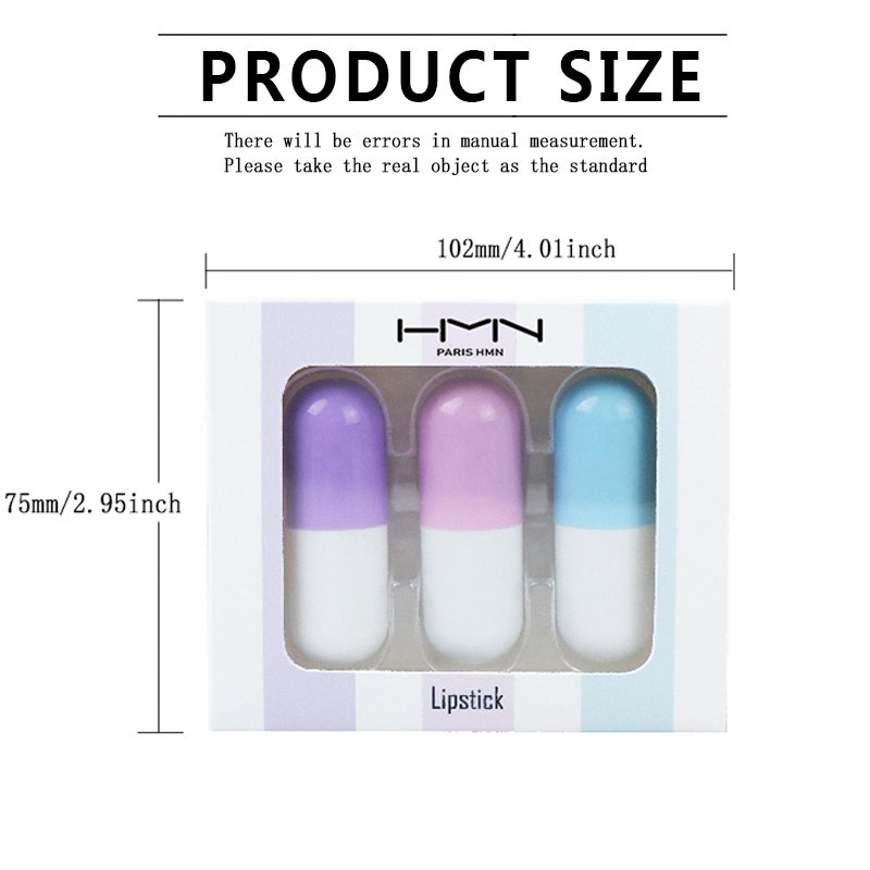 [Vibrant Colors]Experience the brilliance of our mini capsule lipstick set featuring three stunning shades - Vermilion Red, Maple Red, and Caramel Red. These colors are carefully curated to bring life to your lips and make a statement wherever you go.[Luxurious Texture]Indulge in the delicate, smooth texture of our lipstick. Its velvety formula glides effortlessly, leaving your lips feeling silky and hydrated. Enjoy a full-bodied, three-dimensional color with a touch of sophistication.[Long-lasting & Transfer-Resistant]Our lipstick set is formulated with a revolutionary misting film technique that ensures long-lasting wear without smudging or transferring. Say goodbye to frequent touch-ups and hello to a luscious pout that stays vibrant throughout the day.[Cruelty-Free & Gentle]We believe in beauty without harm. Our lipstick set is created using a cruelty-free production process, so you can enhance your natural beauty with a clear conscience. The mild formulation is gentle on your lips, providing a comfortable and enjoyable makeup experience.[Portable & Adorable Design]Our mini capsule-shaped lipstick set is not only a makeup essential but also a fashion accessory. Its cute and compact design allows for easy carrying, ensuring you can touch up your lip color on the go. With a semi-matte finish and exceptional color locking ability, your lip color will remain intact for hours.