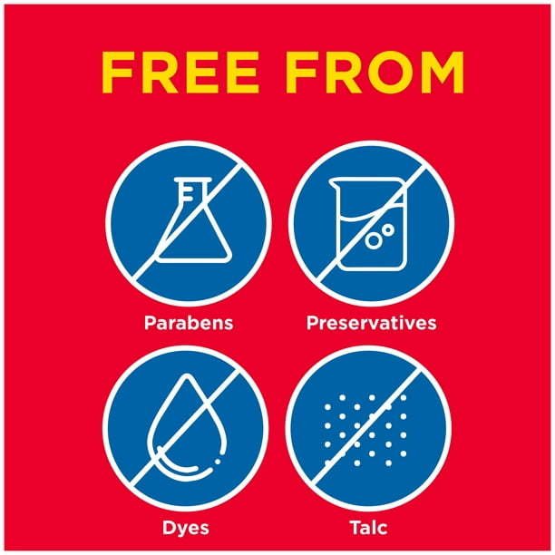 Free from dyes, preservatives, parabens and talc
