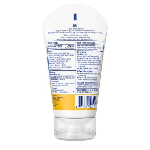 Desitin Multipurpose Healing Baby Ointment helps instantly relieve irritated skin while sealing out wetness. Ideal for baby diaper rash relief, treatment and prevention, this versatile skin ointment is made with white petrolatum skin protectant and also has many uses for infants, kids, and adults. With its smooth, easy application, this clear barrier ointment is ideal for soothing cracked, chafed skin, relieving chapped lips, protecting cuts, scrapes, and minor burns, and as a dry cuticle treatment. This diaper rash ointment also helps protect skin from the drying effects of wind and cold weather. Free from parabens, phthalates and fragrances this dermatologist-tested baby ointment is also the #1 choice of pediatricians and parents and is safe for use on sensitive skin.