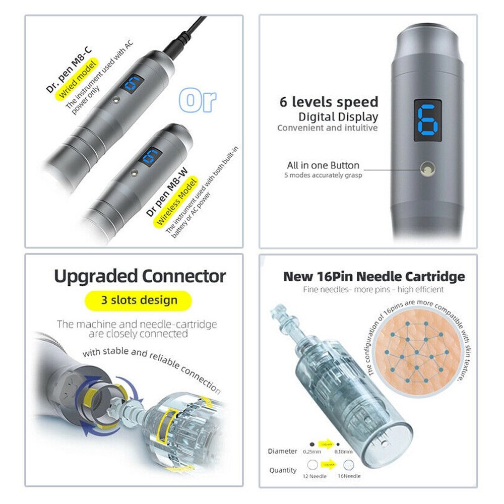 Dr. Pen M8-W 6 SPEED Electric Derma Pen Stamp Recharger Auto MicroNeed1e Roller 2x 12Pin Cartridges