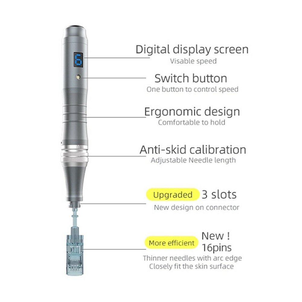 The Dr P Ultima M8 Skincare Kit is your answer to your skin's wishes! The DR P M8 kit features a digital LED display to show you which speed you're working on (6 speed levels) and has a BUILT IN battery! The finest needle gauge pin cartridges on the market for less discomfort and less trauma to the skin. The needles have an arc edge for improved efficiency; designed to flatten uneven skin surfaces when micro-needling.The most powerful motor up to 22000RPM!