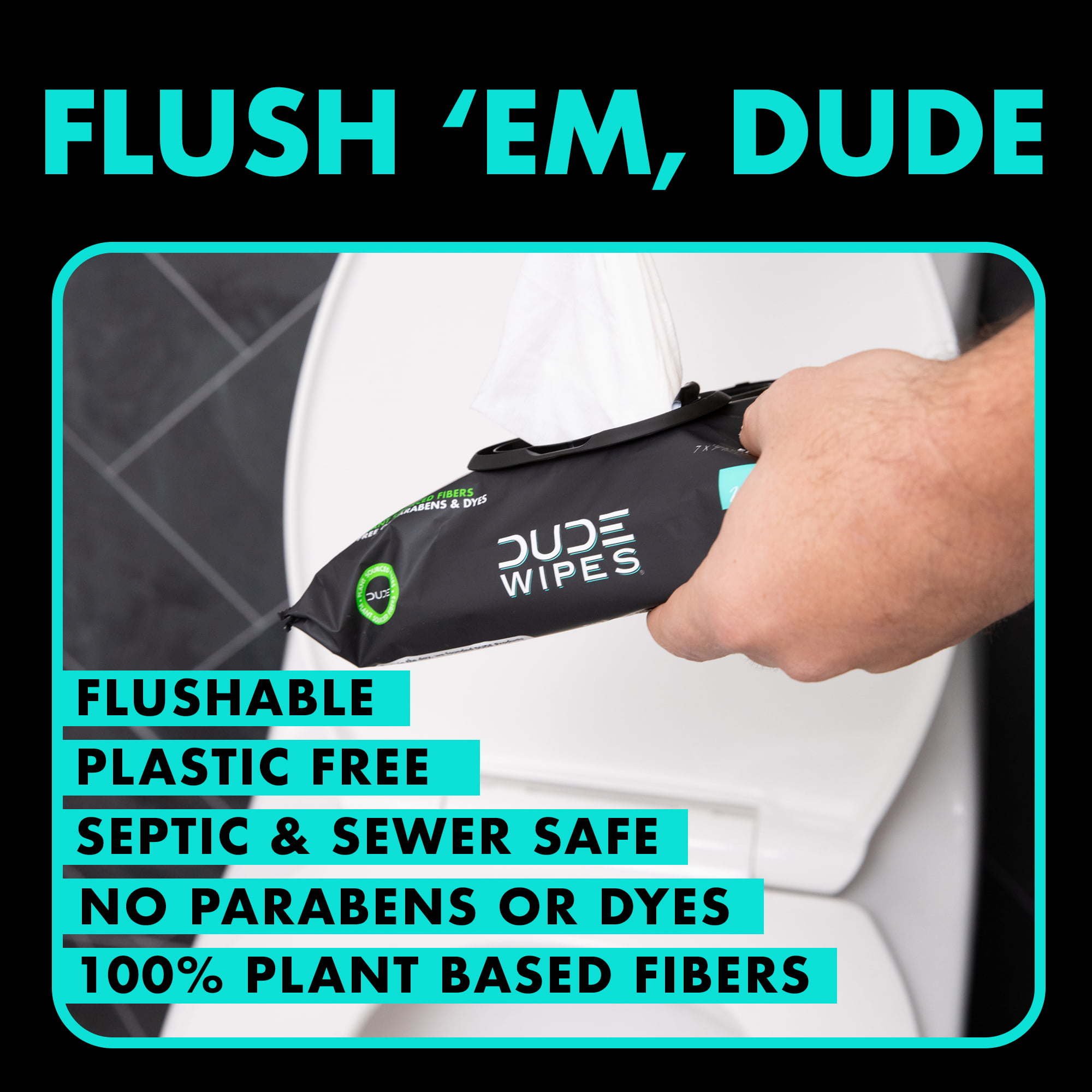 Send toilet paper back to the Stone Age where it belongs! DUDE Wipes Flushable Wipes are like a breath mint for your butt. Made with 99% water and plant-based ingredients, including Eucalyptus, Mint, Tea Tree Oil, Aloe Vera, and Vitamin E, our butt wipes are gentle on your skin and formulated for a more refreshing feeling than toilet paper. So go ahead and tell your friends: you officially have the freshest butt in the game. When it comes to flushable wet wipes, size matters. Good thing we're big. We're up to 35% larger than the other guys (because nobody wants a little wipe after a big burrito). Our flushable wipes are made with plastic-free and plant-sourced fibers to help protect both the planet and your pipes. Unlike baby wipes, DUDE Wipes begin to break down once flushed, making them sewer-safe and septic-safe. Plus, our plush wet wipes come in sleek dispenser packs that fit perfectly on your throne.