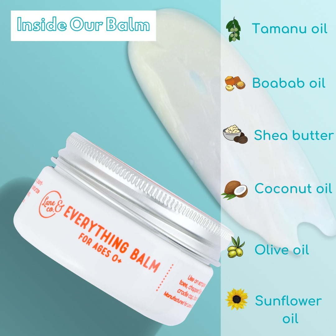 Hello happy skin! Lane & Co Everything Balm is an All Purpose baby balm that can be used by the whole family. Moms, dads, kids, babies, everyone can use our nourishing plant based, vegan all purpose balm that is infused with Organic Shea Butter, Coconut Oil, Boabab and Tamanu Oil that is rich in antioxidants, minerals, and vitamins A, B, C, and E to sooth dry, sensitive and delicate skin. Use on scrapes, scuffs, knees, toes, chapped lips, elbows, cuticles, cradle cap, diaper rash, boo-boo’s and more. Our formula contains NO Petroleum, Lanolin, Beeswax, Phthalates, Dyes or GMO’s. Our All Purpose Balm is Hypoallergenic, Safe For Sensitive Skin and Dermatologist Tested. Size: 2 oz. Say bye bye to sad skin