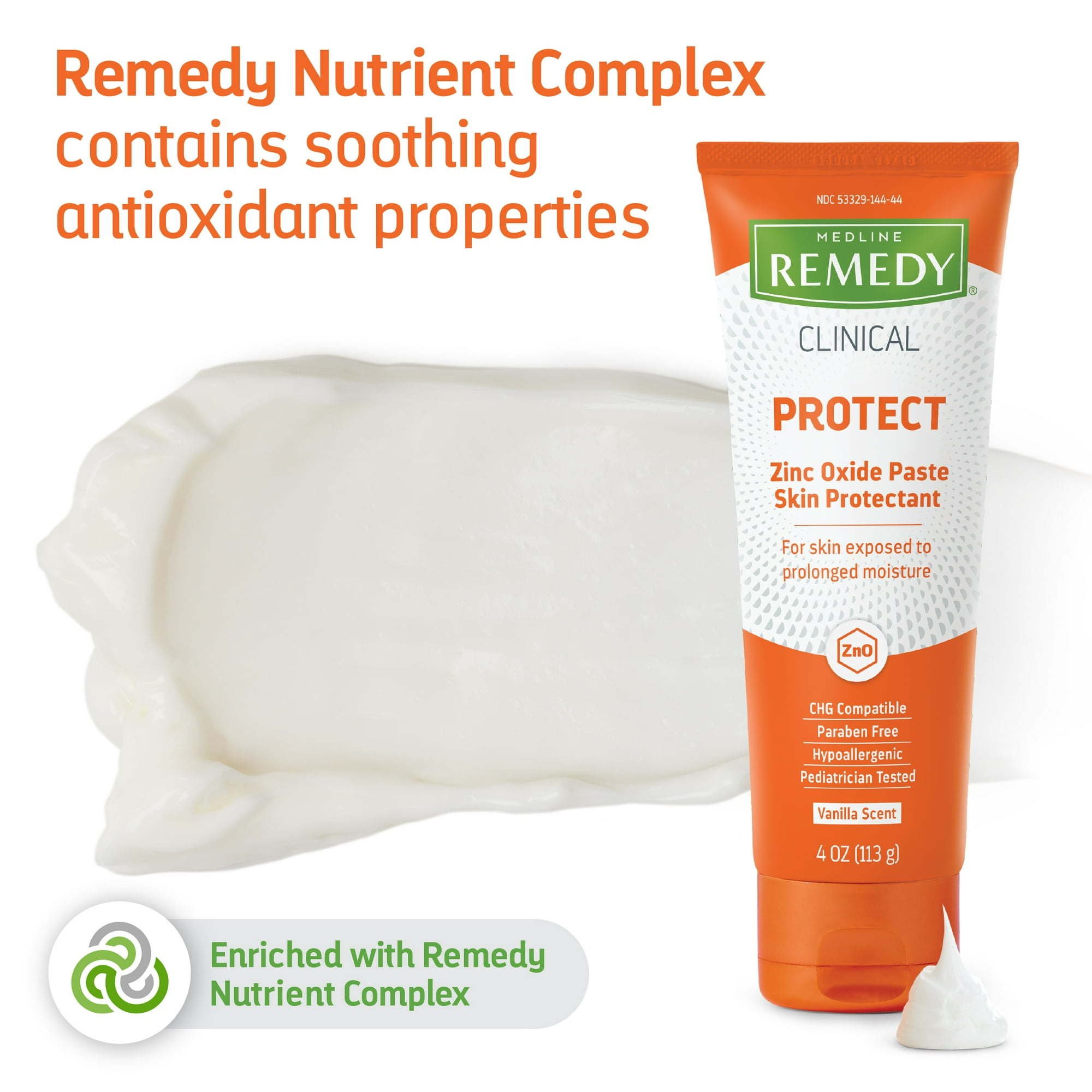 Medline Remedy CLINICAL Zinc Oxide Paste Skin Protectant is specially formulated by our skin care experts to protect skin affected by wetness, urine or stool. Ideal for diaper rash and incontinence protection, a high level of petrolatum offers long lasting protection,reducing the need for re-application which may irritate the affected areas. 17% micronized zinc oxide helps add breathability and a smooth, rich texture that’s easier to apply and remove. It even sticks well to skin with exudate (the wetness that drains from damaged skin) to soothe and protect these difficult areas. Thoughtfully formulated and meticulously crafted to nurture and care for fragile skin, our unique hypoallergenic formula is good for all skin types and safe for adults and children over 2. It’s also sulfate-free and paraben-free, using only proven, high quality ingredients without any harmful additives. And it’s CHG compatible, so it’s good for use by medical professionals who care for all types of patients. This CLINICAL protectant paste is fortified with our proprietary Remedy Nutrient Complex, formerly called Phytoplex. This unique blend includes nourishing botanicals, antioxidants, natural oils, hydrators, moisturizers, emollients and humectants to deliver enhanced support for dry and irritated skin. The convenient squeeze tube or packets fit easily in purse or travel bag, or on a bedside table or drawer, so it’s always ready to use for a consistent daily skin health routine. As the country’s #1 provider of skin care for healthcare, we’re committed to quality care for all skin types that may be at risk due to age, environmental or medical conditions, or everyday dryness. Transform your skin care routine and experience care that goes beyond the ordinary with Remedy CLINICAL Zinc Skin Protectant Paste.