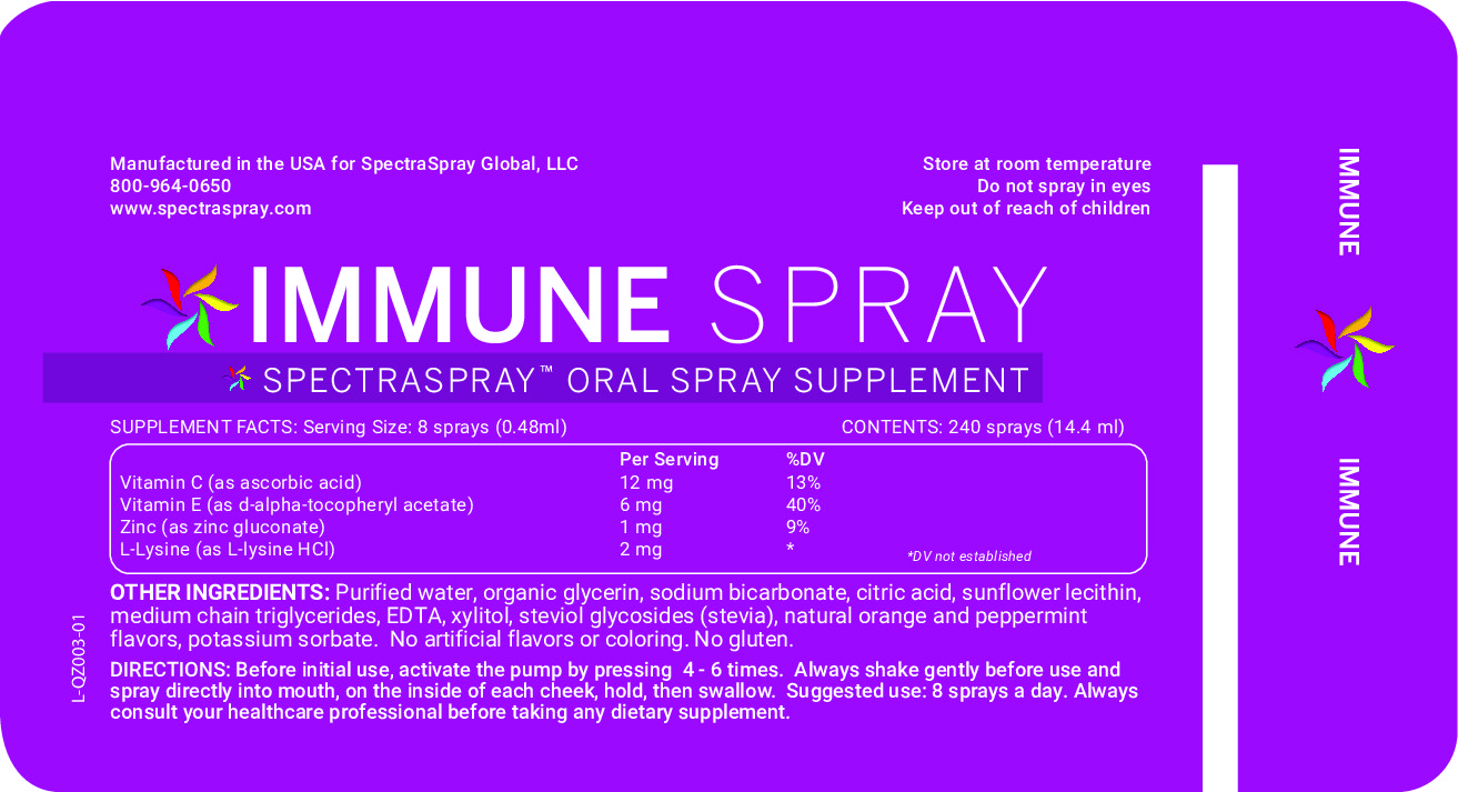 SpectraSpray™ Immune Spray is an easy to use vegetarian oral supplement to support a strong immune system. Avoid the sick days for the whole family, at home, work, school and on vacation. Creates an oral barrier from bacteria and germs. Unique formula with Zinc, C,E + Lysine. Superior oral absorption provides effective results. Take it anytime, anywhere with no need for food or water. • Immune Support • Travel Wellness • Fight with Zinc • Orange + Mint flavor Diabetic + Bariatric patient friendly. TSA compliant. Sugar free, gluten free, dairy free. No binders, fillers or allergens. Non-GMO. Made in USA. 30 servings| 240 sprays - 8 sprays each. Active Ingredients: Sodium L-ascorbate (vitamin C / buffered); vitamin E-acetate; zinc gluconate; L-lysine HCl; cholecalciferol