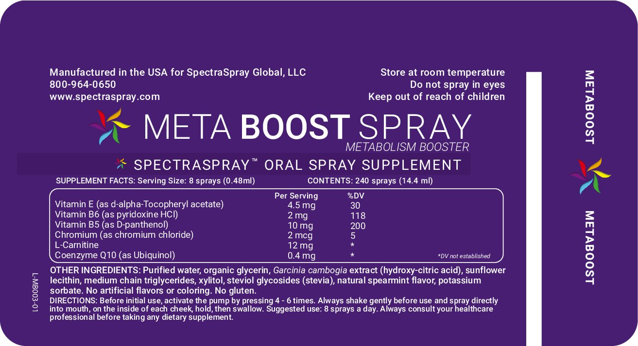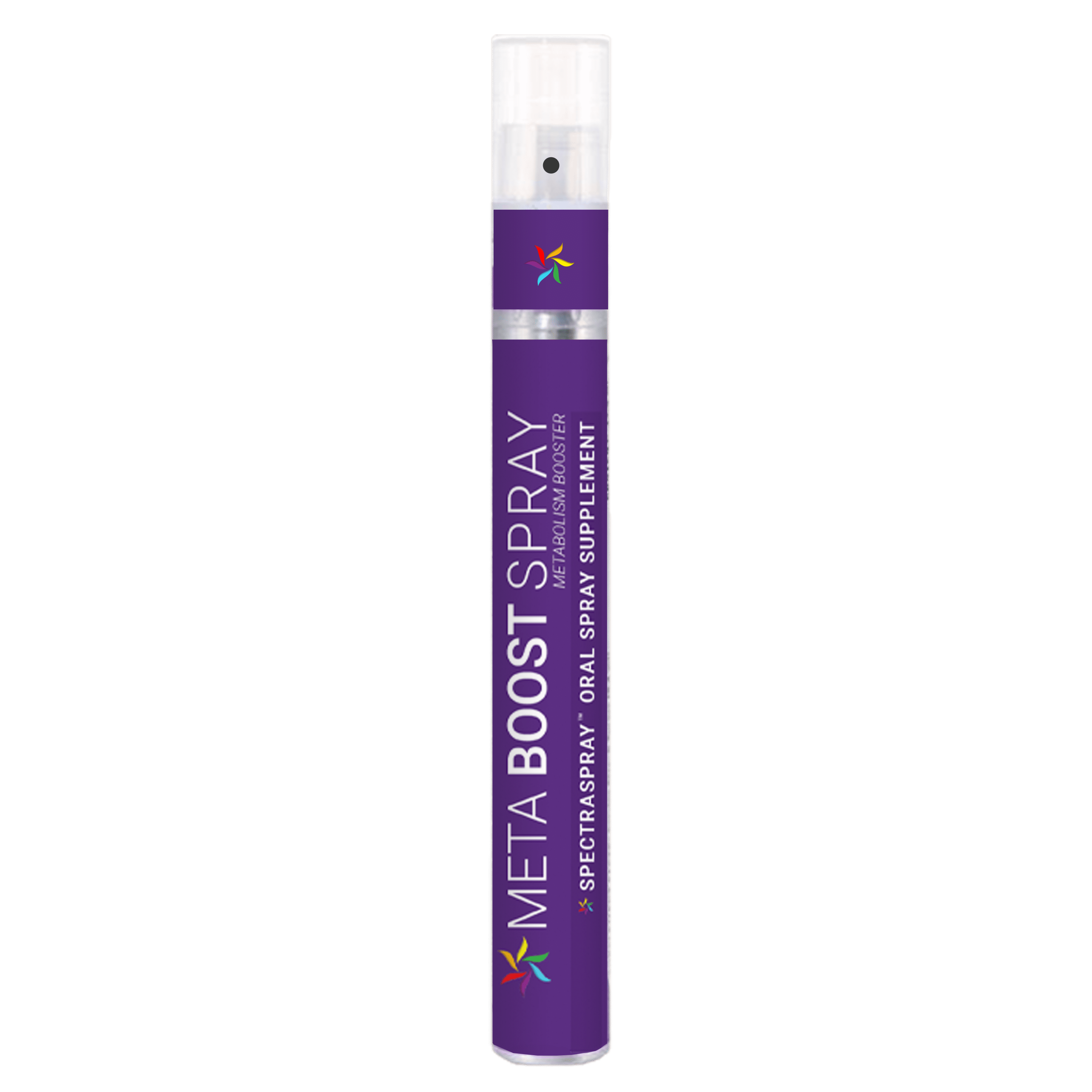SpectraSpray's new MetaBoost oral spray supplement is  a one-of-a kind metabolic booster  formulated by our spray vitamin expert chemist to support weight loss, curb cravings, support energy production and help regulate insulin + healthy blood sugar levels, naturally and without caffeine or stimulants! Superior oral absorption provides effective results. MetaBoost's unique ingredients are proven to support multiple factors of a healthy metabolism, including Vitamin B5, Vitamin B6, L-Carnitine, Coenzyme Q-10 + Garcinia Cambogia (Hydroxycitric acid). Helps promote the burning of unwanted fat in your system. A proper dietary intake along with regular exercise is highly recommended and required for sustainable weight reduction. May help curb carb and sugar cravings when used as advised.