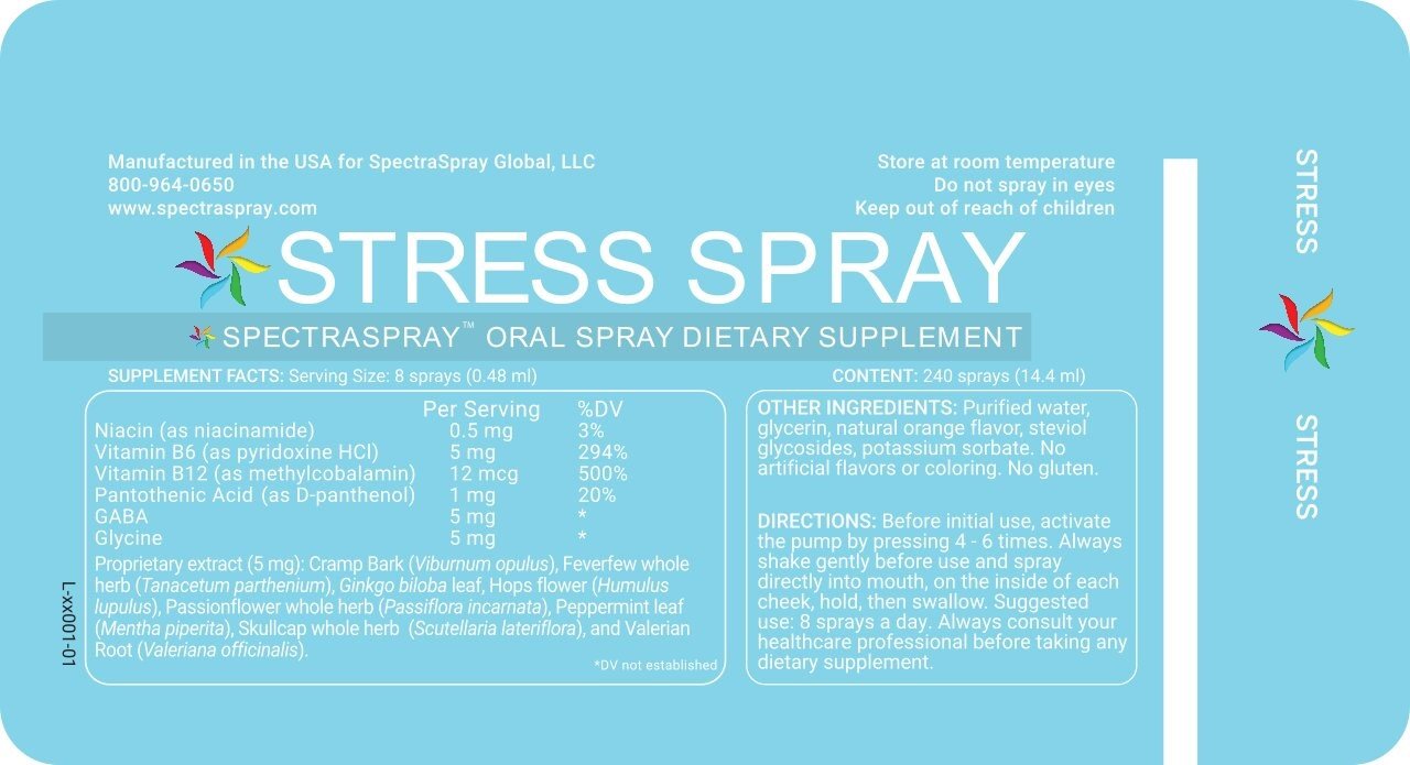 SpectraSpray™ Stress Spray is an easy to use vegan oral spray to help 'take the edge off' during your stressful day. Superior oral absorption gives you fast results. Take it anytime, anywhere with no need for food or water. A unique combination of B vitamins, GABA, Glycine & well studied stress reducing herbs. • Relaxation + Calm • Wellness + Longevity • Replaces depleted B Vitamins, • Nervous System Support • Hormone Support Diabetic and Bariatric patient friendly. TSA compliant. Sugar free, gluten free, dairy free. No binders, fillers or allergens. Non-GMO. Made in USA. 30 servings; 240 sprays- 8 sprays each. Active Ingredients: B Vitamins - B3, B5, B6, B12 Proprietary Herbal Formula: Cramp Bark, Hops Flower, Peppermint Leaf, Feverfew, Ginkgo Biloba, Passionflower, Skullcap, Valerian Root.
