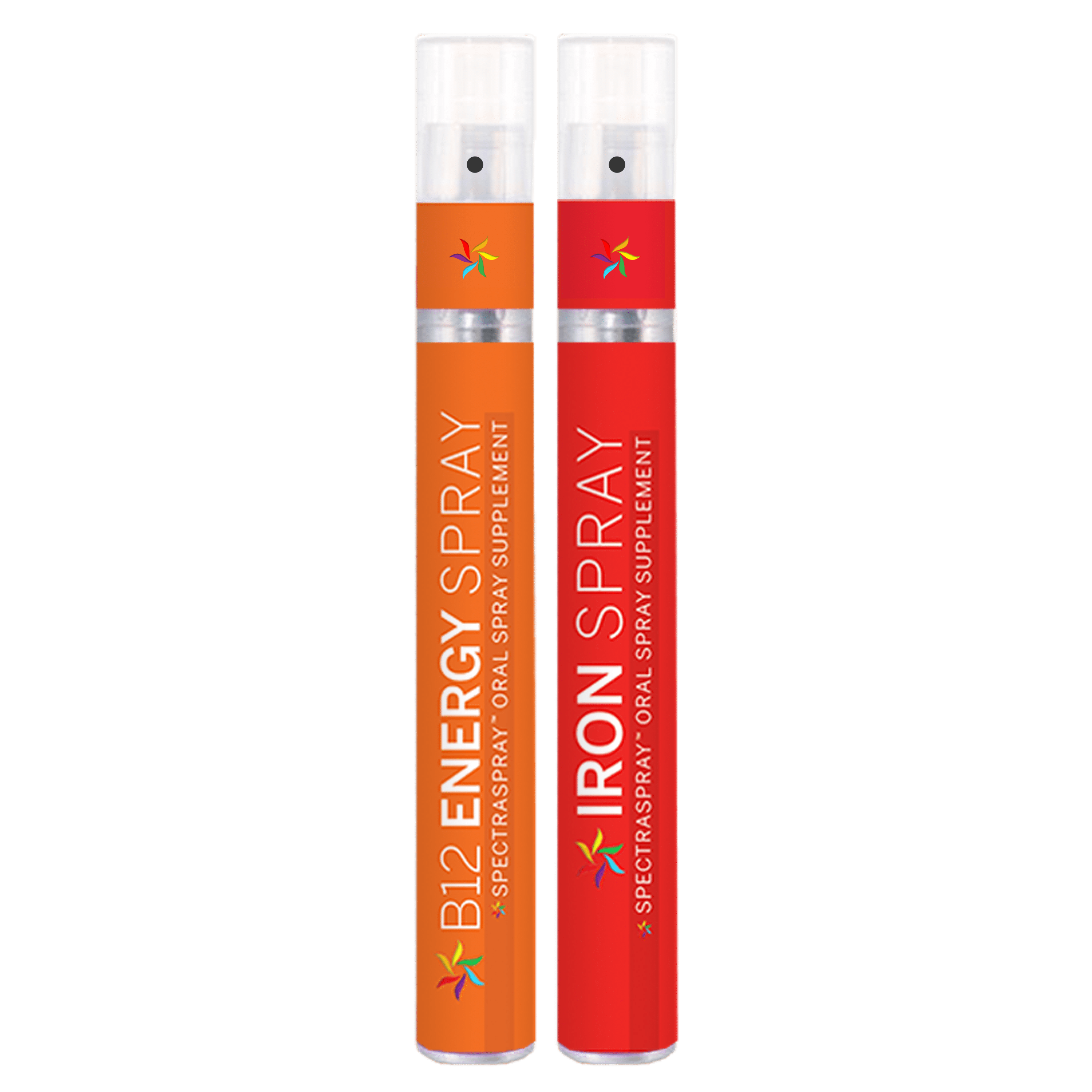 SpectraSpray™ Iron Power Kit is a vegan oral spray supplement kit that supports healthy iron levels. Combined with B12 to help transport the iron into your cells. Start seizing the day and say goodbye to fatigue. We use the highest food grade Ferrazone® brand iron so your body can use it easily. Superior oral absorption provides effective results. Take it anytime, anywhere with no need for food or water. Be sure to get your Iron blood levels checked by your health professional regularly. • Ferrazone®brand iron; the highest food-grade iron ingredient • Fight daily fatigue • Support healthy iron levels • Supports healthy circulation • Non constipating • Non-metallic orange flavor Diabetic and Bariatric patient friendly. TSA compliant. Sugar free, gluten free, dairy free. No binders, fillers or allergens. Non-GMO. Made in USA. 30 servings | 240 sprays | 8 sprays each. Active Ingredients: B12 ACTIVE: 500 mcg Methylcobalamin (activated form of B12) IRON SUPPORT: Ferrazone® XF (iron-EDTA) 3.6 mg (food grade)