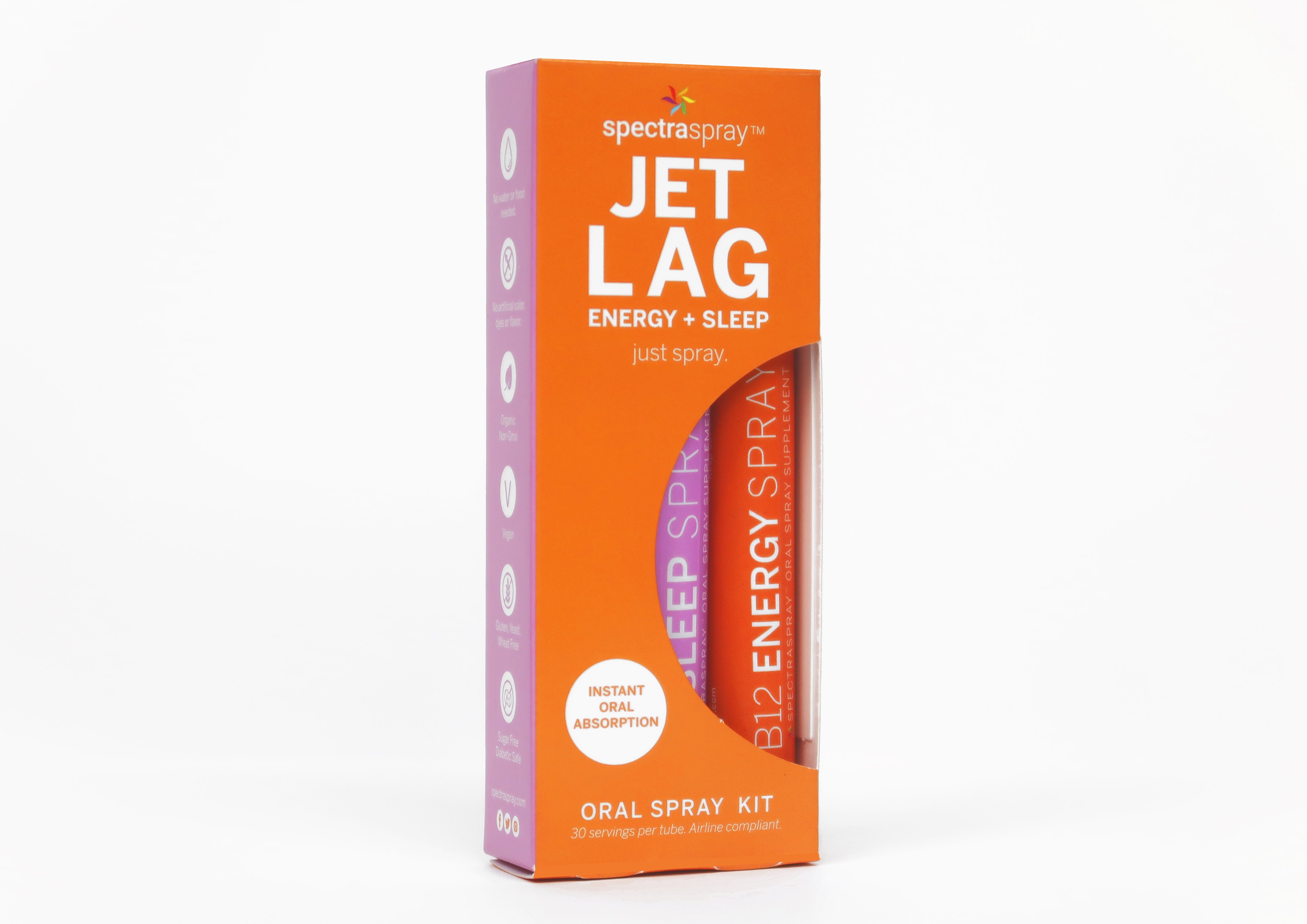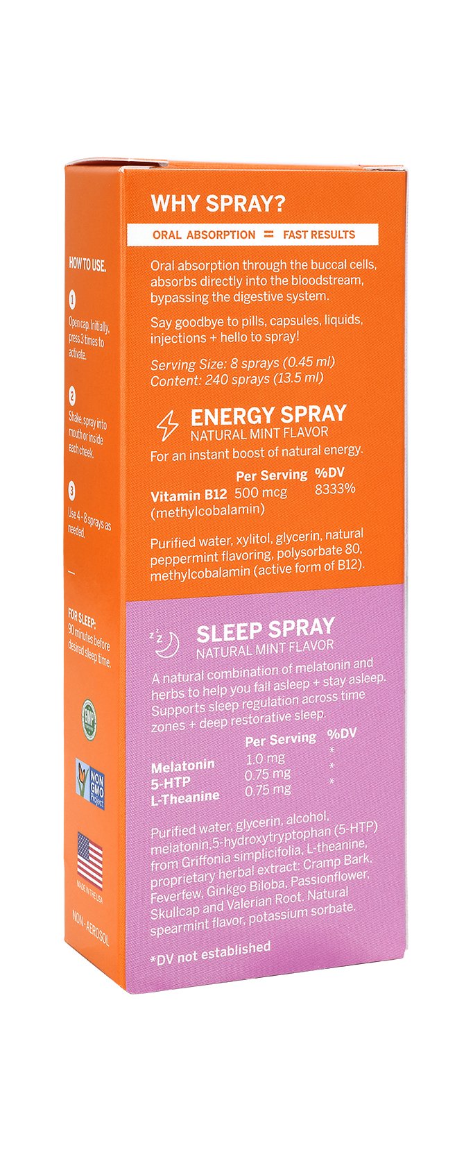 SpectraSpray™ Jet Lag Spray Vitamin Kit is a TSA compliant, vegan oral spray supplement lifestyle kit that conquers Jet Lag and supports energy while traveling. Superior oral absorption provides effective results. Energize your body with B12 during the day, or when traveling through time zones. Support restorative sleep when you need it, wherever you go. Wake up refreshed & ready to go with these on-the-go travel lifestyle sprays that easily fit in your pocket, briefcase or carry-on. • Supports deep quality sleep • On-the-go energy • Time zone adjustment • Relaxation + deep sleep • Proven herbs and amino acids (L-Theanine and 5HTP) • Supports Serotonin & GABA production • Mental clarity Diabetic & Bariatric patient friendly. TSA compliant. Sugar free, gluten free, dairy free. No binders, fillers or allergens. Non-GMO. Made in USA. 30 servings per tube | 240 sprays | 8 sprays each. Active Ingredients: Sleep Spray - Melatonin- 1 mg, 5 HTP (5-hydroxy tryptophan), L-Theanine; proprietary extract-Valerian Root, Cramp Bark, Feverfew, Ginkgo Biloba, Passionflower & Skullcap. B12 Energy – 500mcg Methylcobalamin (active form of B12)